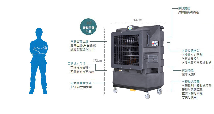 首页产品介绍工厂通风设备变频水冷扇变频水冷扇(UVC杀菌灯选配) 变频水冷扇(UVC杀菌灯选配) M703-COOL 2019_雅速達-公司簡介 2023_雅速達-水冷扇專用目錄 2025_雅速達_工業用產品型錄 功能介绍 产品特色 详细槼格 UVC杀菌灯特点 安装实绩 功能介绍 电源开关 / 紧急断电 启动风扇,可维持上次调整设置 水泵电源 启动抽水到水濂片的循环系统 风扇电源 风扇调速 变频无段式风速整,可调整0-全速之风扇转速 UVC紫外线杀菌灯 与水泵共同运作,可在短时间内去除99%细菌,消毒除臭 产品特色 1. 变频水冷扇100%台湾制造。获ISO、CE等多项专利认证,畅销欧、美、日。2. 变频水冷扇,适用于各种室内、外闷热场所。工厂、汽车修配厂、温室、畜牧业、餐厅、店面、活动场所等皆适用。3. 变频水冷扇采用水濂蒸发式降温,不产生水雾,还可过滤空气中灰尘,带给您凉爽干净的好空气。4. 变频水冷扇搭配空调使用,还可降低空调耗能,减少空调安装数量,节能又环保。5. 变频水冷扇清洁方便、易保养,每周定期清洗一次即可。6. 变频水冷扇可搭配自动进水管功能。另可在水箱中加入冰块,增强降温效果。7. 变频水冷扇可搭配高强度、高能量UVC消毒法原理,其功能是将内部注入的水源,经UVC照射1~5秒就可快速彻底灭菌(灭病毒)的效果,不污染环境、无腐蚀性、功能操作简便…等优点,更通过SGS检验测试。 比较以下三种产品的差异 产品特色 水冷扇 冷气 电扇 价格 经济型 贵 便宜 耗电量 低 高 低 需安装 否 是 否 内含冷媒 否 是 否 湿度高的环境下使用成效 不佳 佳 佳 可移动式 是 否 是 定期维护 是 是 否 适用环境 室内和室外 室内 室内和室外 详细槼格 型号 M703-COOL 外框材质 PE 风叶 30" 三叶塑钢风叶 马达 3/4HP F级 极数 6P 最高转速 1100RPM 最大音量(距风3m测得) 60dB 电压(标准规格) 单相110V,60Hz 最大风距 15m以上 尺寸 长132 x 宽69 x 高172cm 储水量 170L 空机重量 100kg 满水重量 270kg 注:音量数据仅参考用,实际分贝值因安装方式及使用环境而异。 此图为热门型号的风可送达距离,如想了解其他型号规格,请点此: M802 UVC杀菌灯特点 雅速达杀菌灯与市售消毒方法比较: UVC 氯 臭氧 消毒方法 物理 化学 化学 消毒效果 极好 好 不稳定 消毒时间 1~5秒 25~45分锺 5~10分锺 人体危害 极低 中等 高 有毒物质残留 无 有 有 安装实绩 上一笔 回到列表 下一笔 同系列商品 变频水冷扇(UVC杀菌灯选配) M602-COOL 变频水冷扇(UVC杀菌灯选配) M802-COOL 变频水冷扇(UVC杀菌灯选配) M703-COOL 变频水冷扇(UVC杀菌灯选配) M702-COOL 变频水冷扇 M102-COOLN 变频水冷扇(UVC杀菌灯选配) M902-COOL 变频水冷扇(UVC杀菌灯选配) M502-COOL