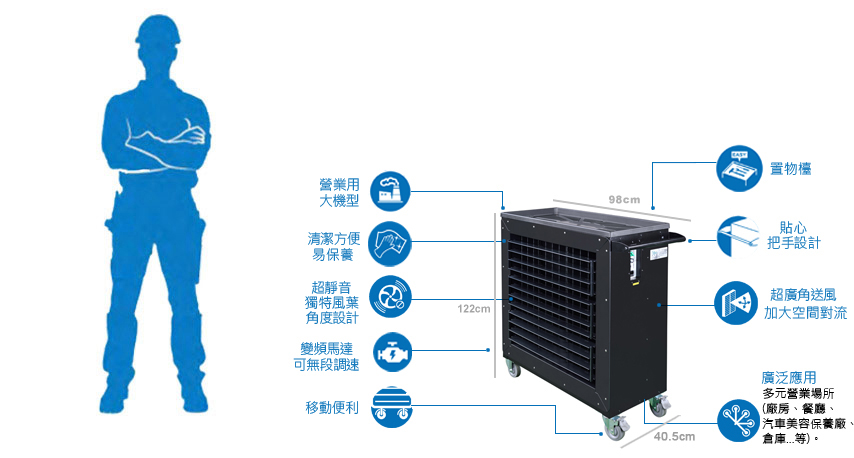 首页产品介绍工厂通风设备变频风扇工具车变频风扇工具车 (黑色百叶窗) 变频风扇工具车 (黑色百叶窗) M704-FE 2019_雅速達-公司簡介 2025_雅速達-變頻風扇工具車型錄 功能介绍 详细槼格 安裝實績 功能介绍 变频面板 内崁式设计 安全不易碰触 电源指示灯 风扇调速 变频无段式风速调整,可调整0-全速之风扇转速 风向摆动 百叶片可左右摇摆改变 风向,增加出风广度 风扇电源 电源插座 详细槼格 类型 移动式 外框材质 FE 百叶窗(黄色/黑色) 外部-3段式上下手动内部-电动百叶 风叶 28" 四叶塑钢 转速 850 RPM 永磁同步马达(PMSM) 650W F级 音量 (距风扇3m测得) 65dB 电压 单相110V,60Hz 电流 8.5 A 用电量 200~690 w/hr±10% 送风距离 25m以上 尺寸 长 99(含把手)x 高 108.5x 宽 41.5cm 总重量 54kg 注:音量数据仅参考用,实际分贝值因安装方式及使用环境而异。 安裝實績 上一笔 回到列表 下一笔 同系列商品 变频风扇工具车 (黄色百叶窗) M804-FE 变频风扇工具车 (黄色百叶窗) M704-FE 变频风扇工具车 (黑色百叶窗) M704-FE